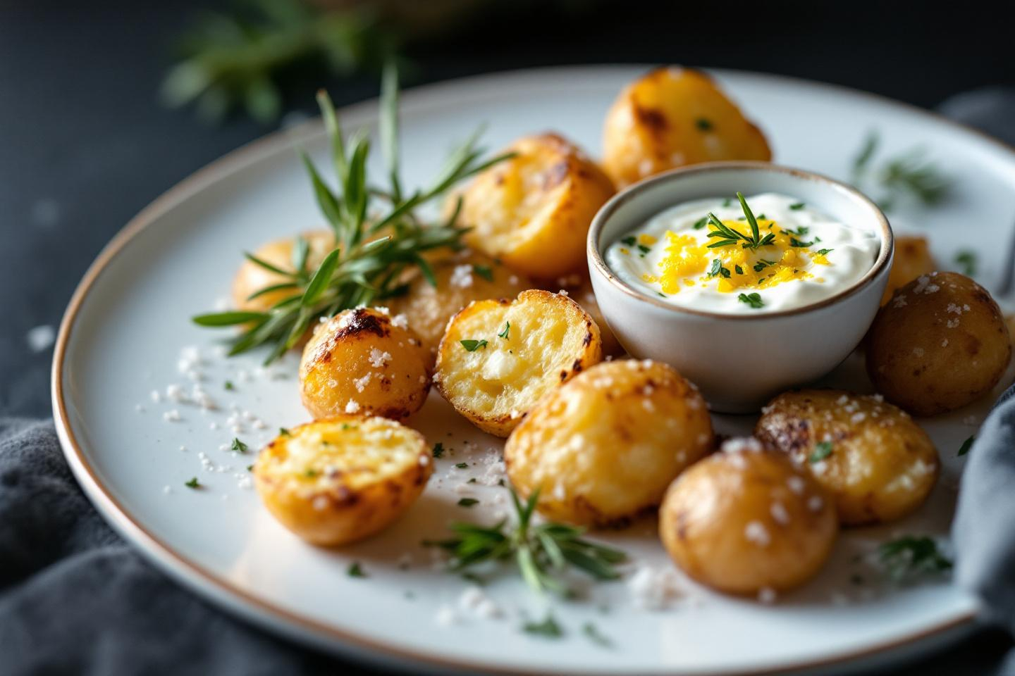 Prêtes en un clin d’œil, ces pommes de terre au four croustillantes et parfumées au romarin régalent petits et grands avec leur sauce yaourt citron gourmande