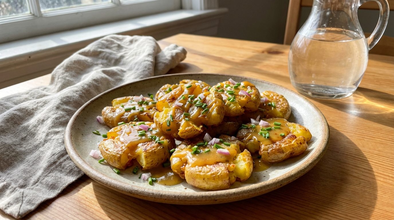 Des pommes de terre écrasées dorées au four, sauce miel-moutarde : le secret d’une salade tiède croustillante qui rend fou petits et grands au déjeuner