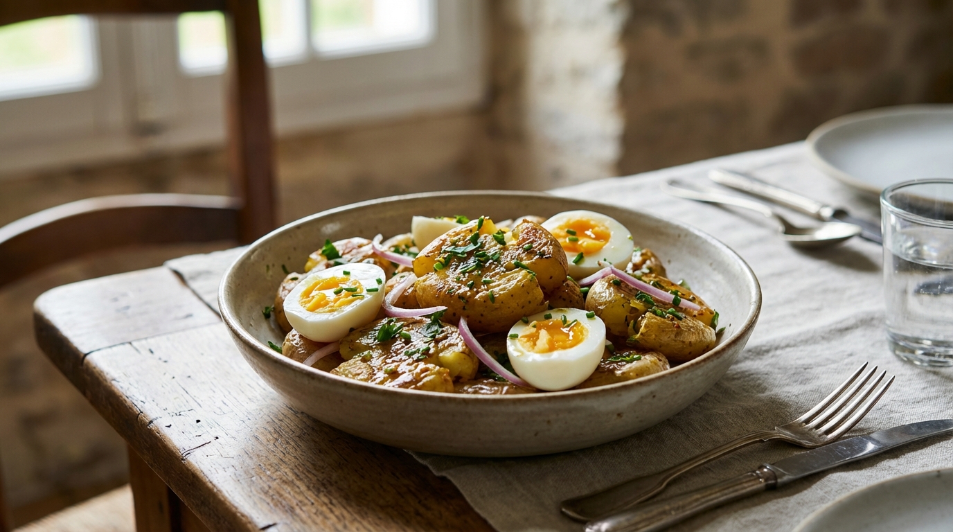 Cinq ingrédients, un four, et le petit miracle des patates écrasées dorées : la salade tiède qui fait croustiller le déjeuner de toute la famille sans chichi